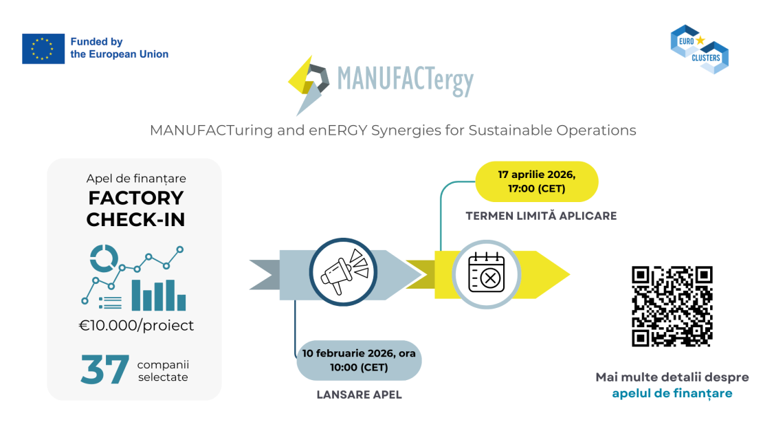 Proiectul european MANUFACTergy, finanțat de Uniunea Europeană, lansează o schemă de finanțare tip cascade funding, destinată sprijinirii IMM-urilor din sectorul manufacturier, în special din industriile mobilierului și construcțiilor, în tranziția către procese de producție mai sustenabile, mai eficiente energetic și mai avansate digital.